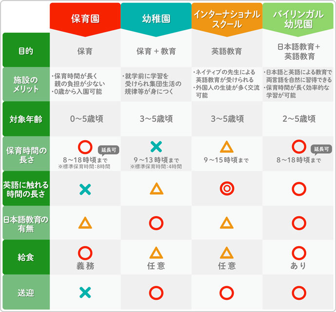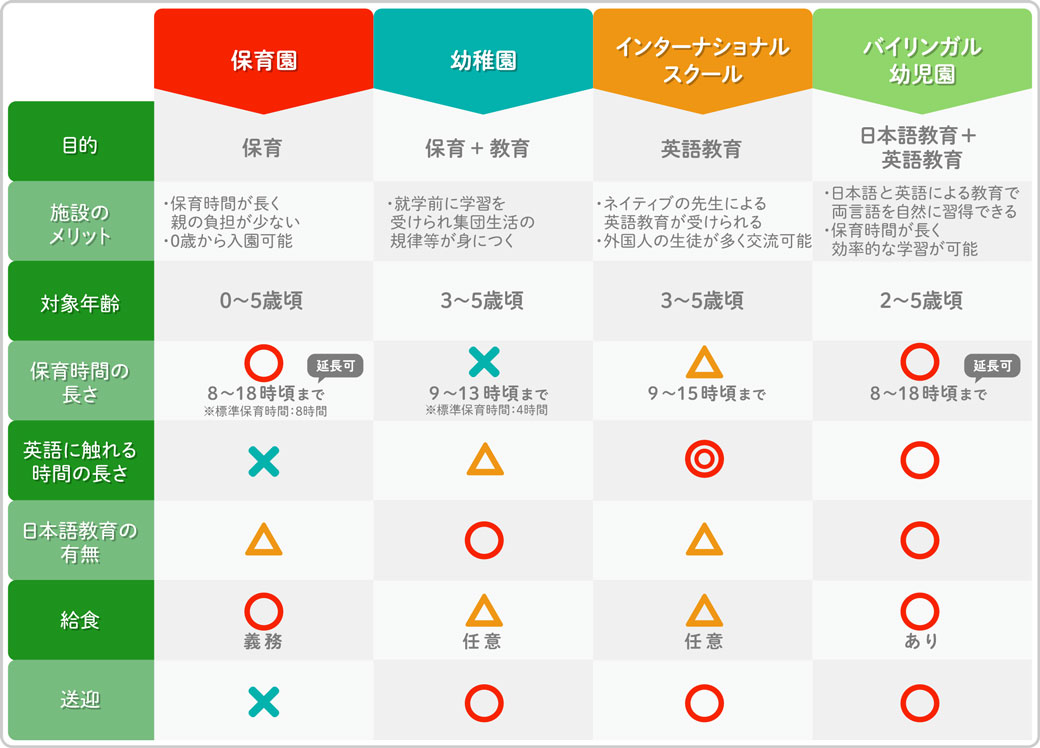 では、あなたのご家庭にはどの施設が合うのでしょうか? 保育園、幼稚園、インターナショナルスクール、バイリンガル幼児園の違いを、ひと目でわかる一覧表にまとめてみました。
